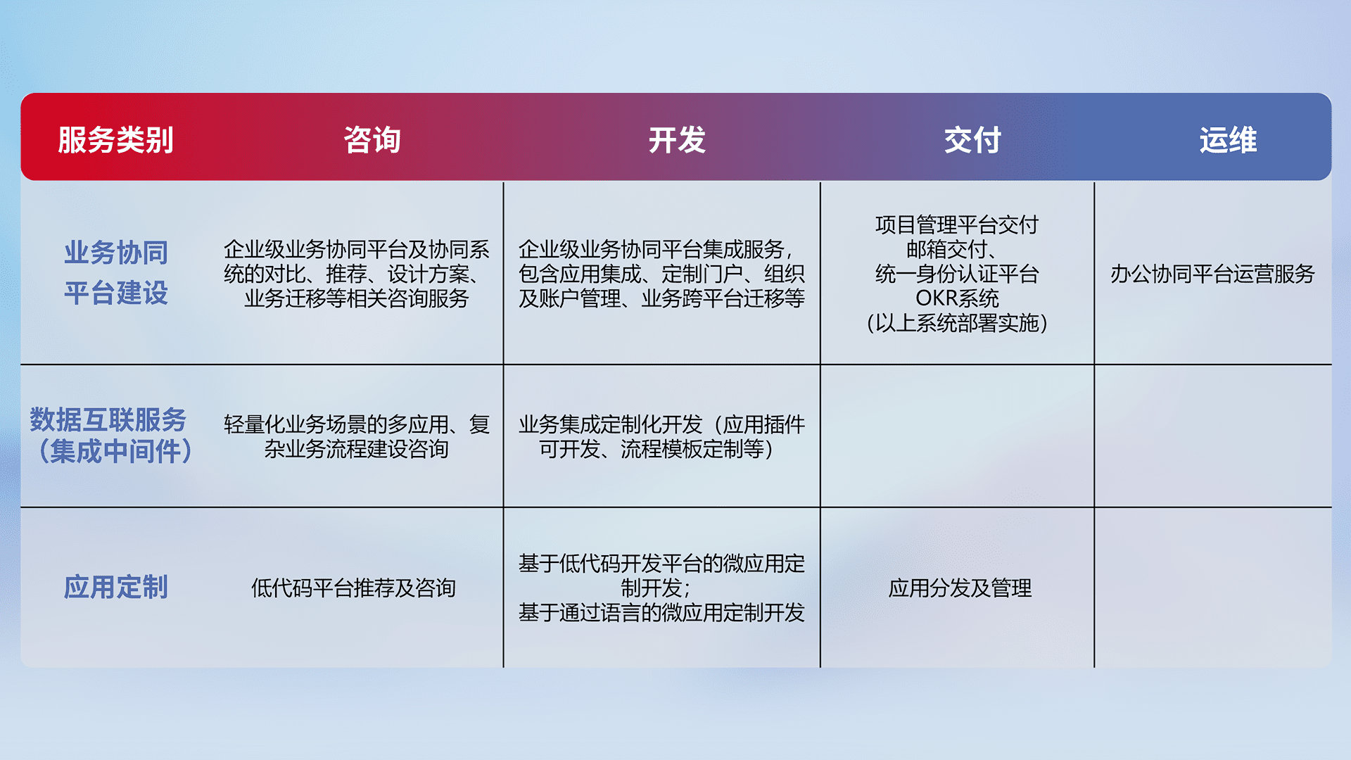 针对钉钉、、企微、、、、IDaas等平台级产品提供产品的规划、、、方案、、、、交付、、、、定制化开发等服务,,实现如统一协同办公、、、智能客户服务、、、混合会议管理、、、、智能数据查询、、等业务场景,,实现数字化转型。。。